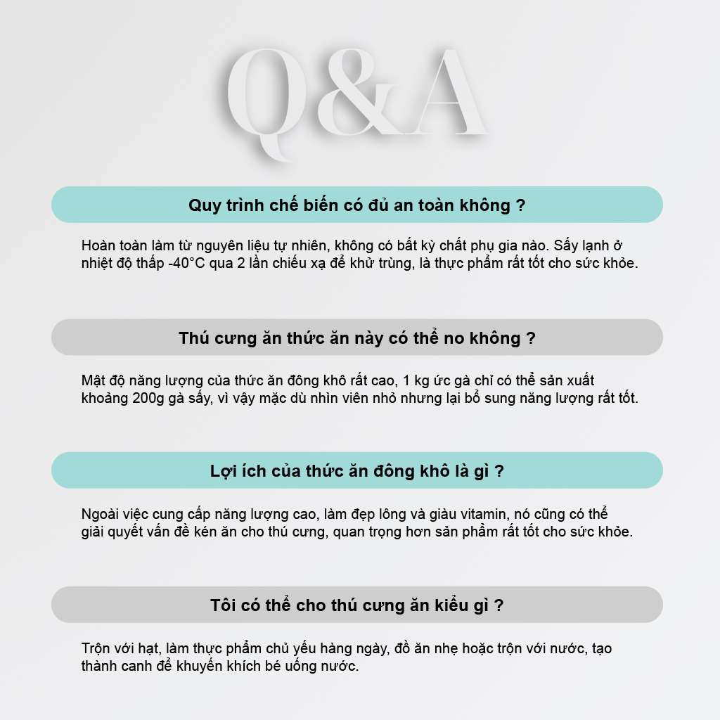 ✅ 100% nguyên liệu tươi sạch (ức gà, gan gà, lòng đỏ trứng gà, cá hồi), không chất bảo quản, không phụ gia.