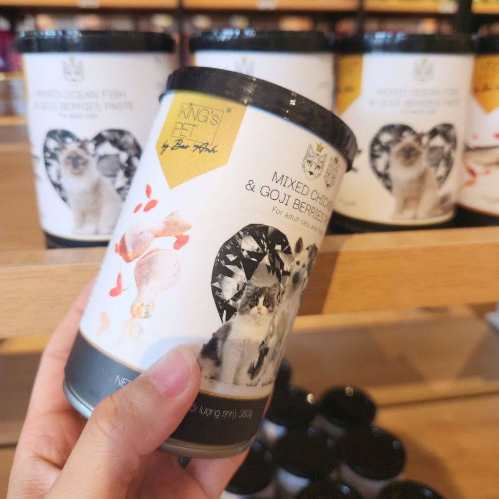 - Chất lượng cao cấp: Pate King’s Pet được sản xuất từ nguyên liệu tự nhiên như cá hồi, cá nục tươi đánh bắt; thịt gà đã được kiểm dịch chặt chẽ; thịt giò heo; rau củ tươi ngon;...