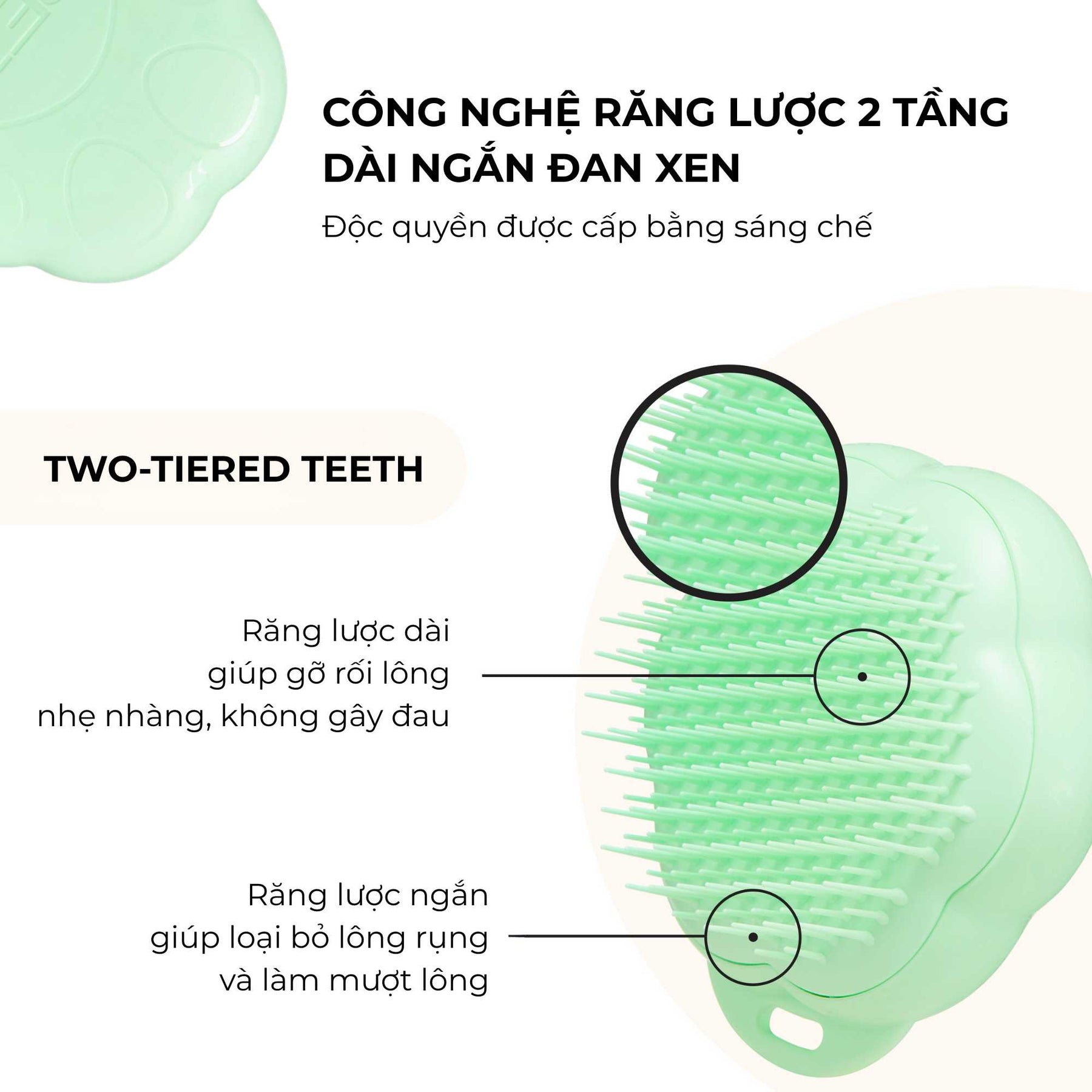 - Công nghệ răng lược 2 tầng (two-tiered teeth) độc đáo: Răng dài giúp gỡ rối lông nhẹ nhàng mà không gây đau, răng ngắn hơn giúp loại bỏ lông rụng và làm mượt lông.